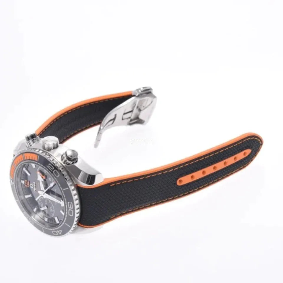 At its core is the Omega Co-Axial Master Chronometer Caliber 9900, a METAS-certified automatic chronograph resistant to magnetic fields up to 15,000 gauss. The 60-hour power reserve ensures dependable performance, while the sapphire case back reveals the movement’s finishing. Paired with a black rubber strap accented with orange stitching, this Planet Ocean balances rugged capability with modern sport style.