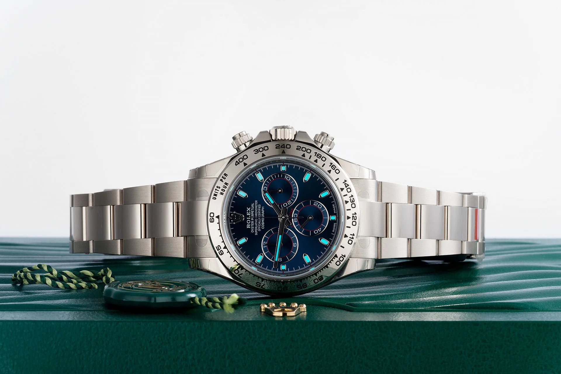 At its core is the Rolex Caliber 4130, a self-winding mechanical chronograph movement engineered for precision and durability. Known for its efficient architecture and reduced component count compared to traditional chronographs, the 4130 provides approximately 72 hours of power reserve and exceptional reliability. The three sub-dials ensure accurate elapsed time measurement, while the engraved tachymeter bezel reinforces the model’s motorsport heritage. With 100 meters of water resistance and Rolex’s Triplock crown system, the 116509 is built for both performance and daily wear. Among precious-metal Daytonas, the white gold-blue dial configuration remains one of the most versatile and sought-after options.