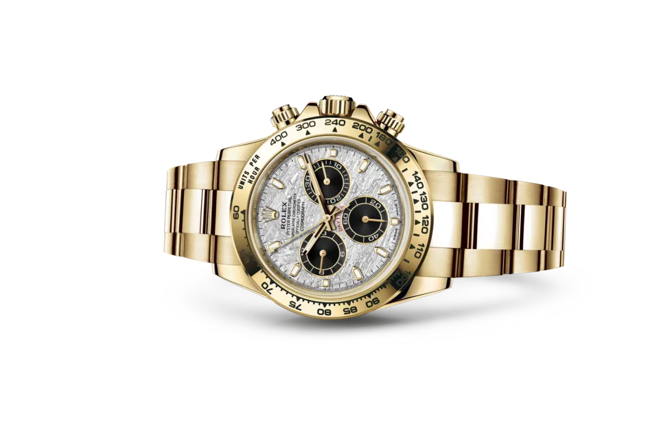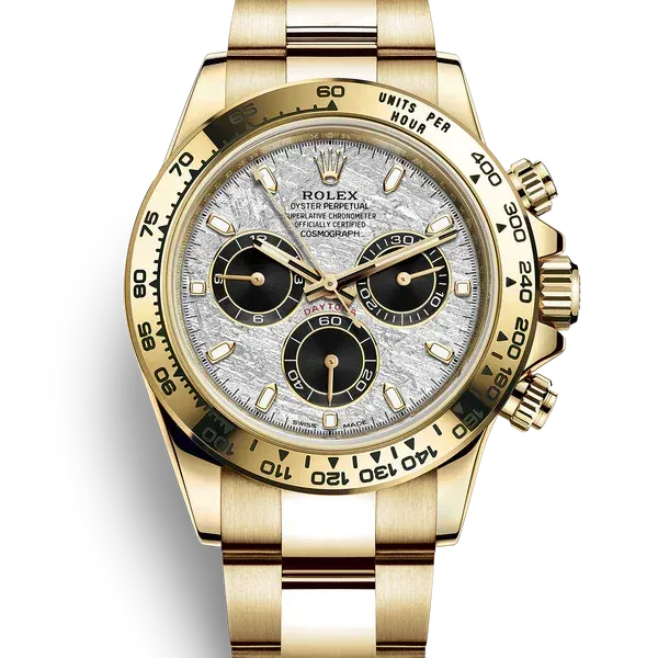 The Rolex Daytona 116508 Meteorite Dial stands among the most exclusive variations of the Cosmograph collection. Crafted from solid 18 ct yellow gold, the 40 mm Oyster case delivers the unmistakable weight and presence expected from a precious metal Rolex. What truly sets this reference apart is its genuine meteorite dial. Formed over millions of years in space, meteorites feature natural Widmanstätten patterns that cannot be replicated, so no two dials are ever identical. This natural texture gives the watch a depth and character rarely seen in modern luxury chronographs.