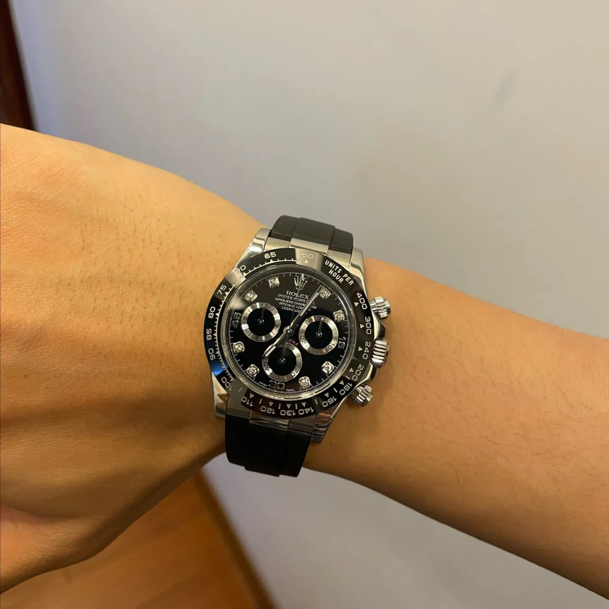 The Rolex Cosmograph Daytona 116519LN-0025 represents a bold evolution of the iconic racing chronograph, combining precious metal construction with contemporary sport refinement. Crafted from solid 18 ct white gold, the 40 mm Oyster case delivers substantial presence while maintaining the balanced proportions that define the Daytona collection. The black dial, set with diamond hour markers, creates a dramatic contrast against the white gold sub-dials, enhancing both legibility and visual depth. Framing the dial is a black monobloc Cerachrom ceramic bezel with a moulded tachymetric scale, offering exceptional scratch resistance and long-term color stability.