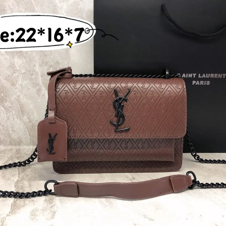 Its confident texture and controlled structure define the YSL Sunset Monogram Embossed Leather Shoulder Bag. Its dimensional leather finish sets it apart from smoother editions, offering a tactile luxury that enhances visual impact. For the modern woman seeking a handbag that merges bold design with refined functionality, this Sunset edition remains a sophisticated and enduring choice.